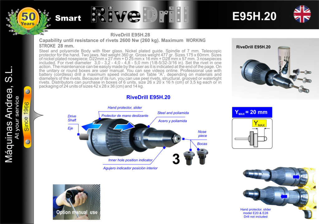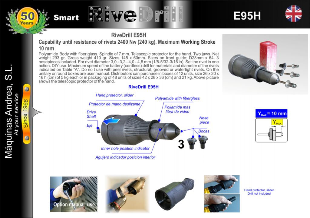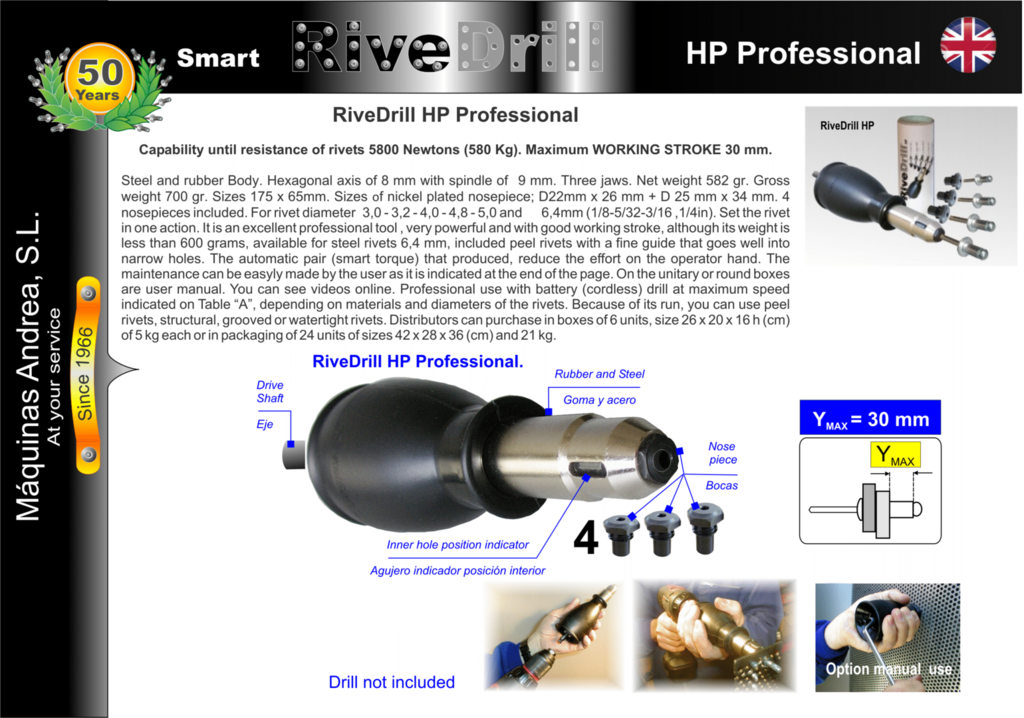 Para eleguir bien el modelo hay que tener en cuenta el tipo de remache y el espesor de remachado. Los remaches tipo flor necesitan más carrera debido a que tienen mayor recorrido para romper, por lo que para ese tipo de remaches necesita nuestra máquina RiveDrill High Power y hasta 6,4 mm de diámetro y con mayor potencia y 30 mm de carera. Todos los modelos disponen de 3 bocas para diámetro de 3, 4 y 5 mm de diámetro, excepto la RiveDrill RD98 de bricolaje.