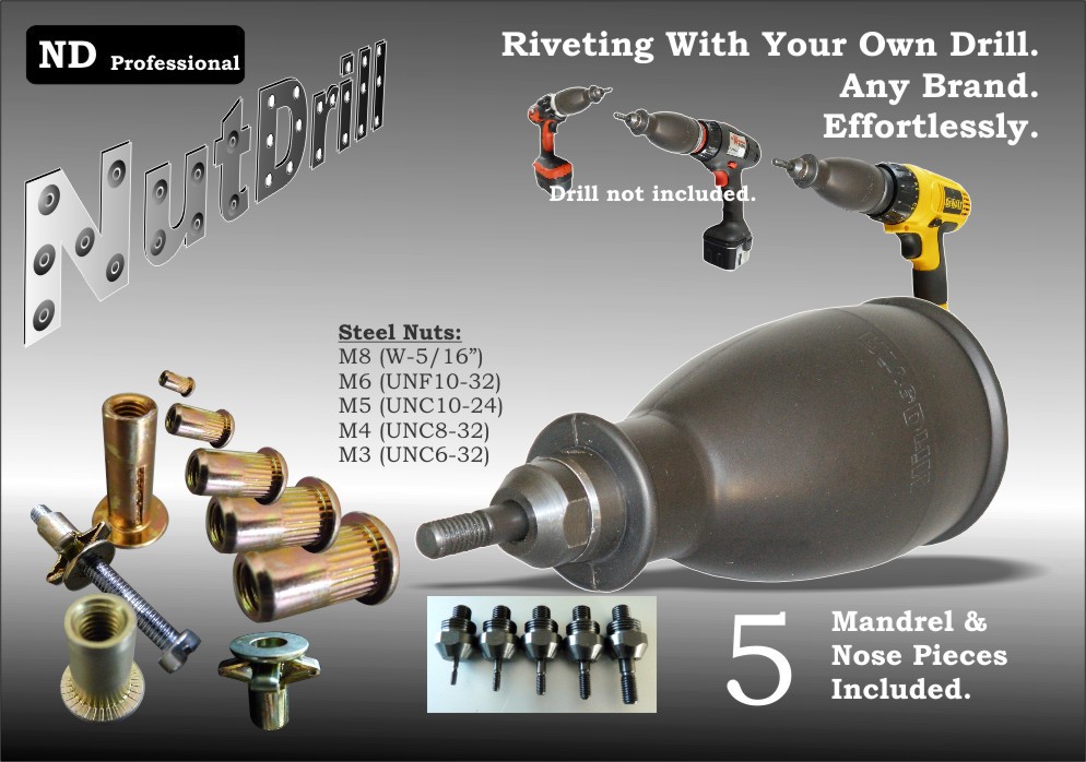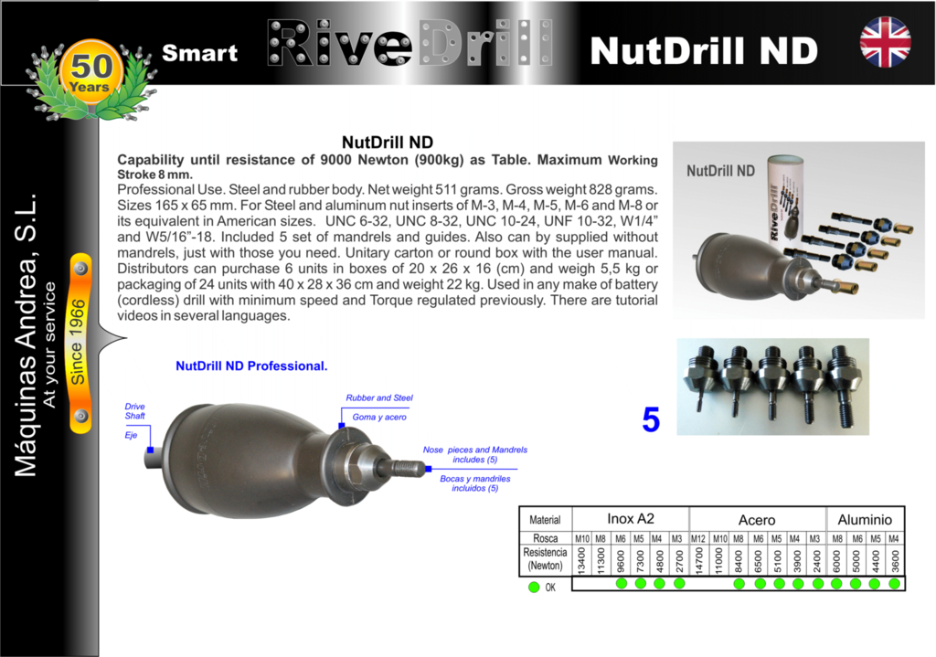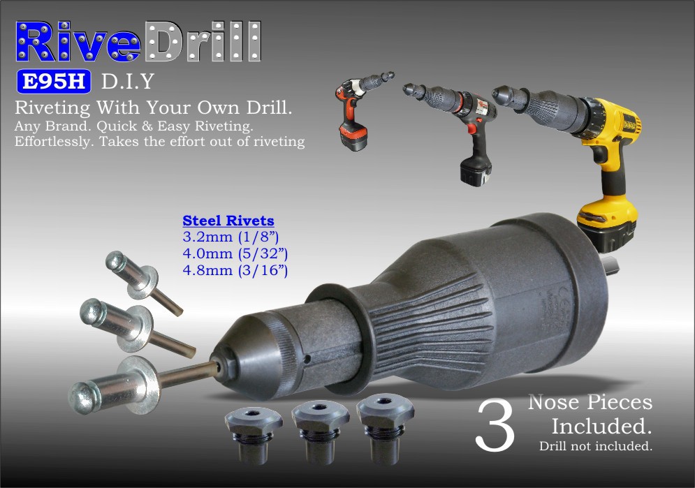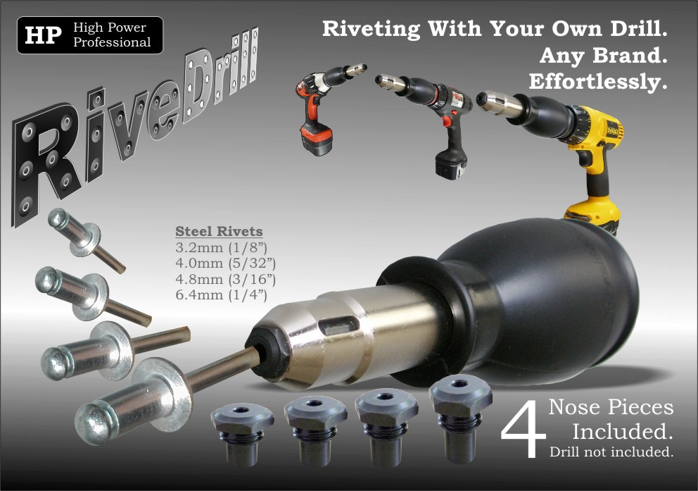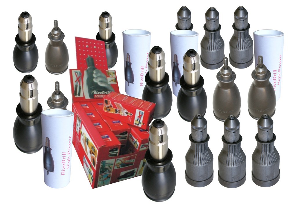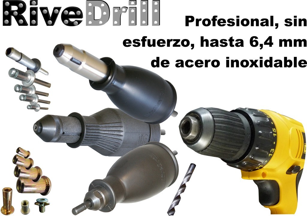 Fabricamos varios modelos de remachadoras RiveDrill para uso doméstico profesional de remaches tubulares o POP e insertos roscados o roscas insertables. La remachadora RiveDrill es útil para fijaciones permanentes, con remaches tubulares o pop y para fijaciones desmontables con insertos roscados o roscas insertables.